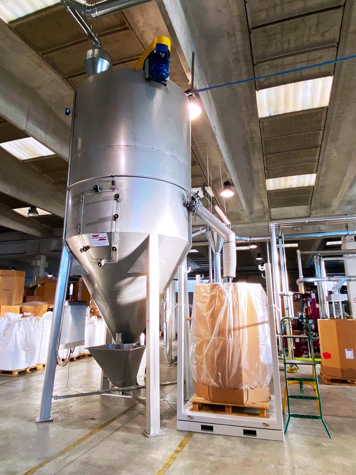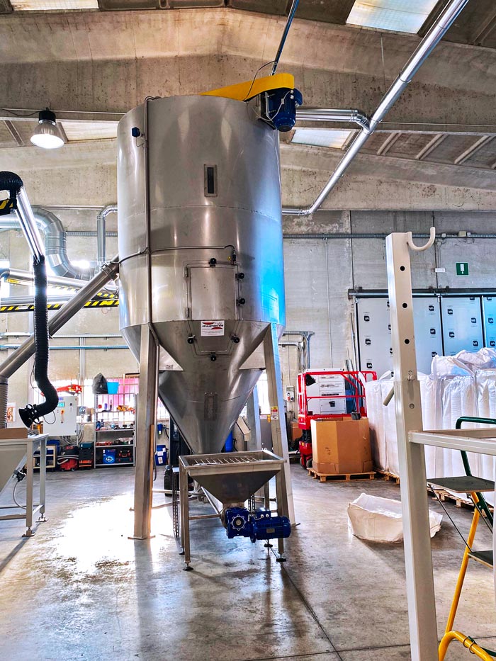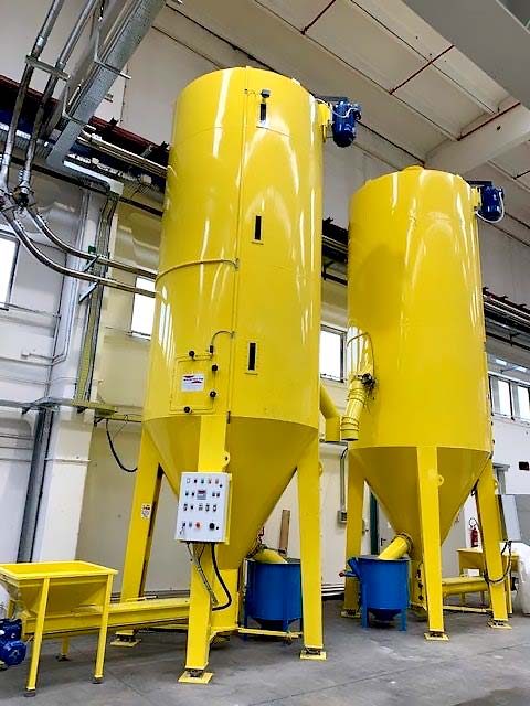 INDUSTRIEMISCHER ZUM HOMOGENISIEREN UND LAGERN VERSCHIEDENER MATERIALIEN WIE GRANULAT, MAHLGUT, FLOCKEN, MASTER, PULVER